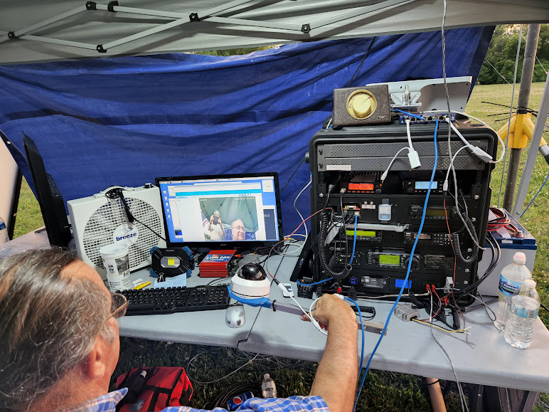 This picture was taken at Field Day 2022 in Ann Arbor, Michigan. Note the photographer on the screen being captured by the PTZ camera on the AREDN microwave network. An AREDN node is sitting atop the Go-kit and was linked to other nodes on the FD site as well as a rooftop 1/2 mile away.